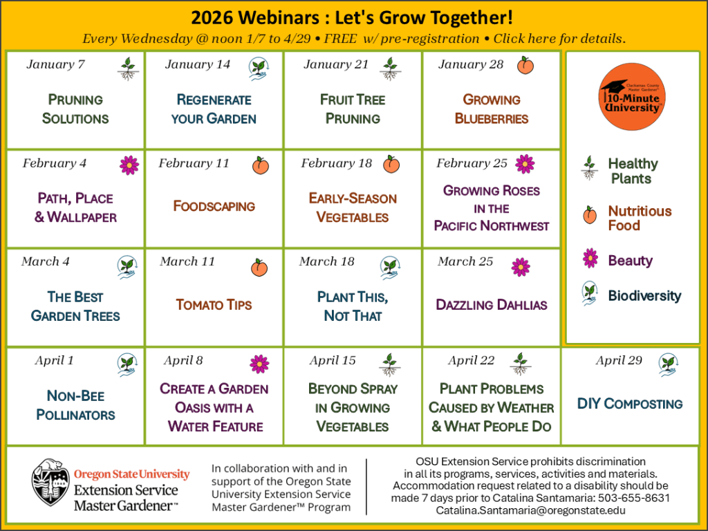 The Clackamas County Master Gardener™ Association in collaboration and in support of Oregon State University Extension Service. OSU Extension Service prohibits discrimination in all its programs, services, activities and materials on the basis of race, color, national origin, religion, sex, gender identity (including gender expression), sexual orientation, disability, age, marital status, familial/parental status, income derived from a public assistance program, political beliefs, genetic information, veteran’s status, reprisal or retaliation for prior civil rights activity. (Not all prohibited bases apply to all programs.)